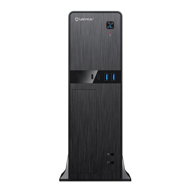 El frontal de la caja UK2011 Slim MATX tiene un acabado con efecto aluminio, lo que le da un aspecto elegante y moderno. Además de su atractivo diseño, la caja cuenta con dos conectores USB 3.0 y dos conectores Type C (USB 2.0), lo que la hace perfecta tanto para entornos profesionales como personales.