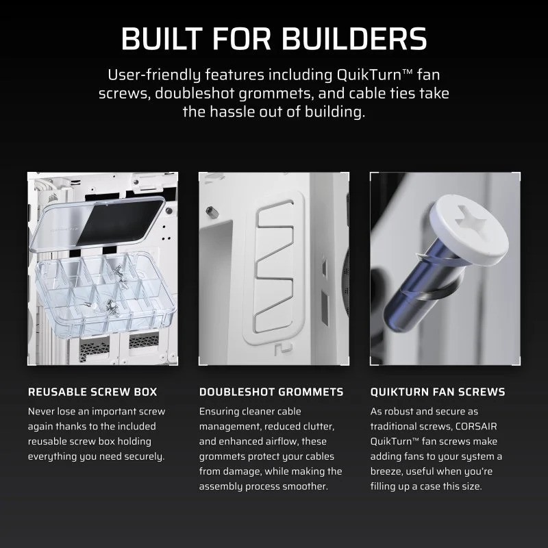 • Características amigables para el ensamblador - Una gama de innovaciones de CORSAIR mejora la experiencia de construcción, incluyendo soporte para montaje vertical sin brackets adicionales, tornillos Quikturn de un giro, pasacables flexibles de doble inyección y cortes externos para la gestión de cables.