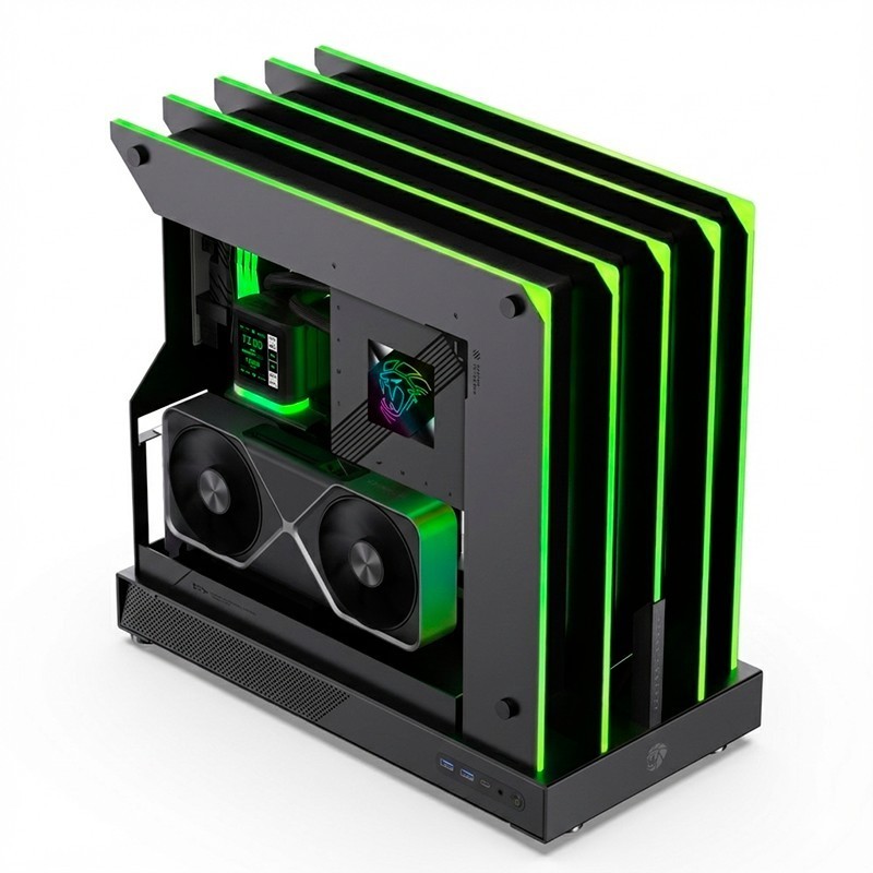 BLADE es una edición limitada que fusiona estética industrial y diseño gaming para un look brutal y exclusivo; su diseño open-air maximiza el flujo de aire y luce tus componentes desde cualquier ángulo, la iluminación RGB tipo garra aporta un impacto visual potente con un acabado metálico de gran precisión, y está preparada para montajes premium con GPU en vertical y un panel de conexiones moderno con USB-C.